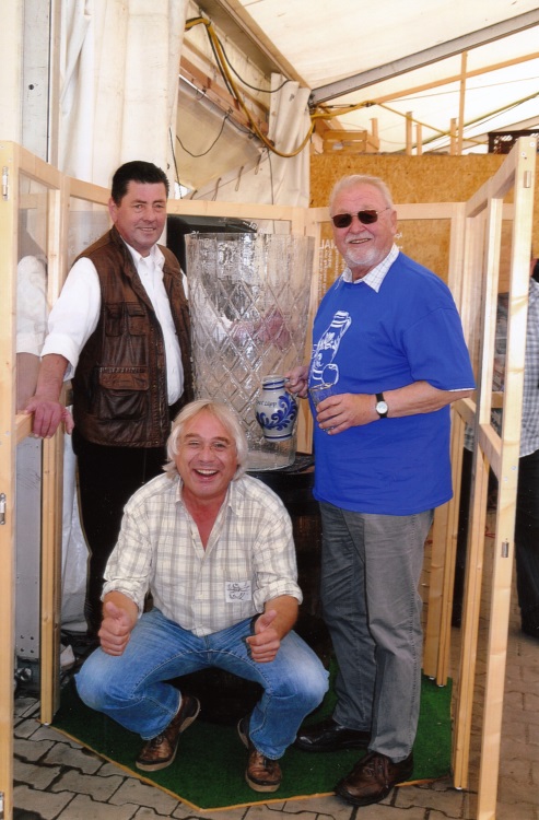 Größtes Äppelwoiglas der Welt mit Gastwirt Lipp, Keltermeister Jörg Stier und Hans-Peter Langlotzbei einer Präsentation 2014.